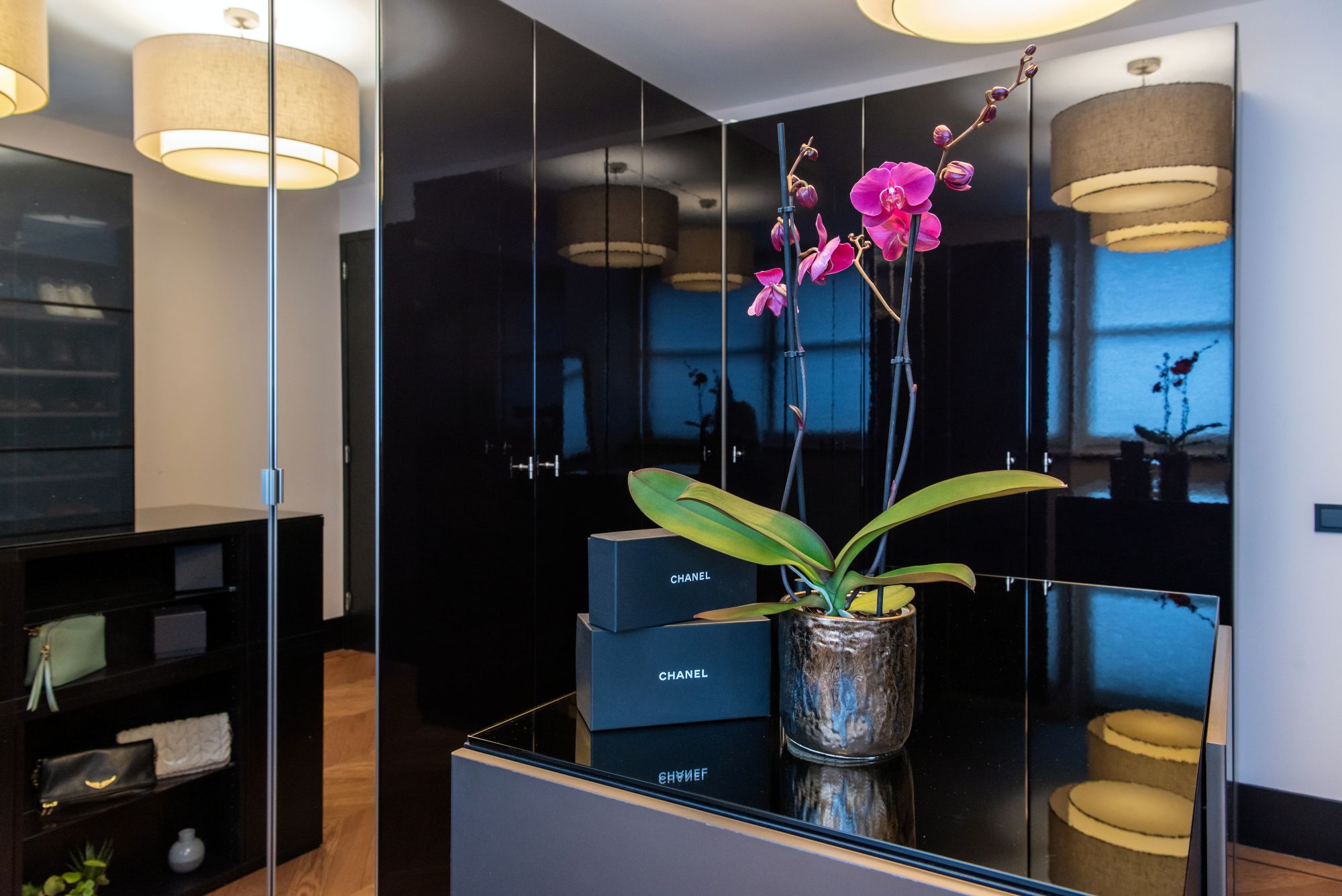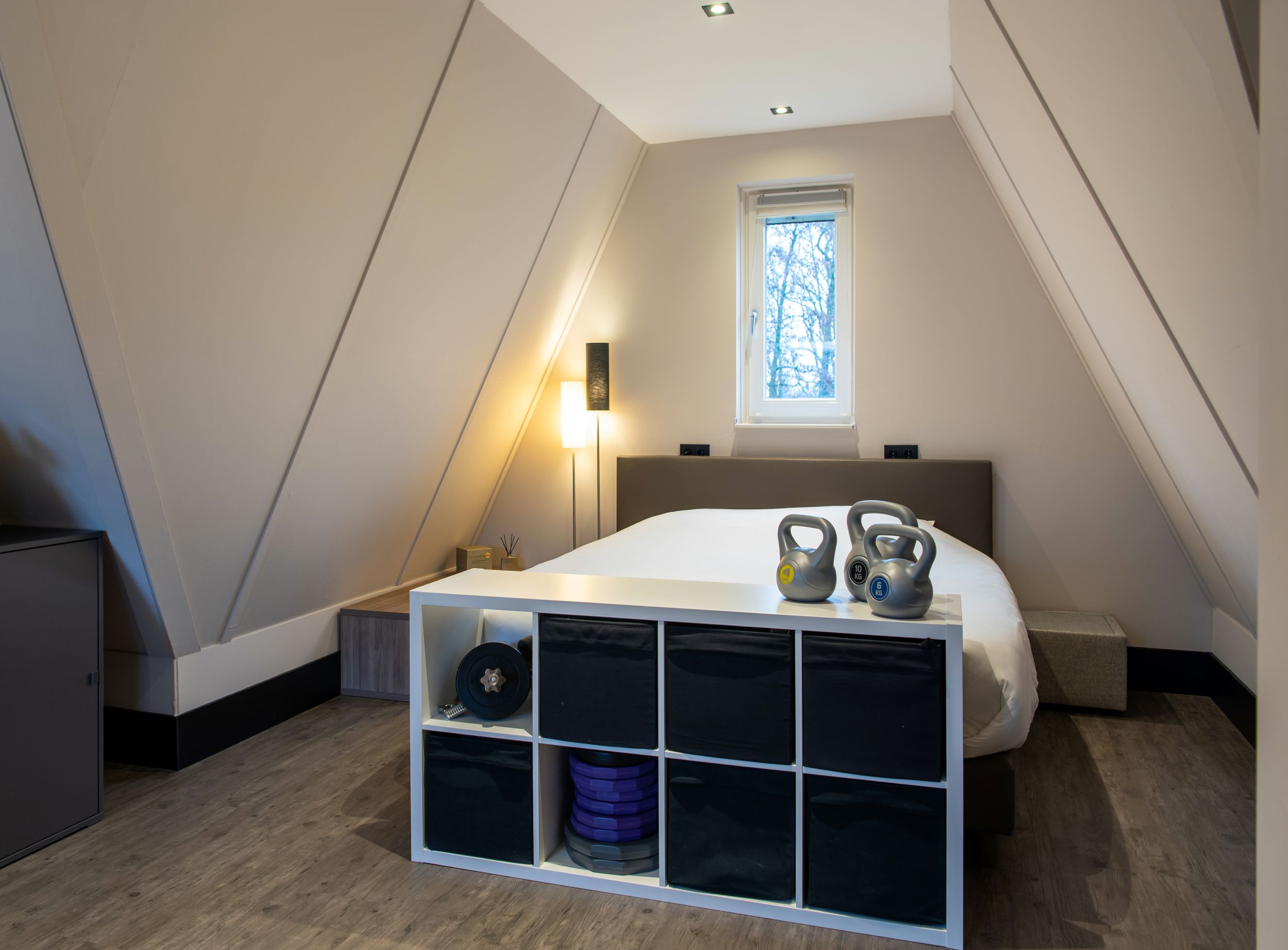 Over samen doen gesproken: de ultieme relatietest legden ze af in de inrichting van de kleedkamer. Hoge kasten van het bekende Zweedse woonwarenhuis werden met eigen handen getransformeerd tot een walk-in closet in glanzend zwart. Finishing touch: centraal een dressoir, bronzen passpiegel en Piet Boon-greepjes. Nog een etage hoger, die in gebruik is als luxe logeerkamer en de werkplek van Heleen is, werd een vliering gemaakt. Heleen: “Kunnen we toch een hoop spullen uit het zicht opbergen.”
