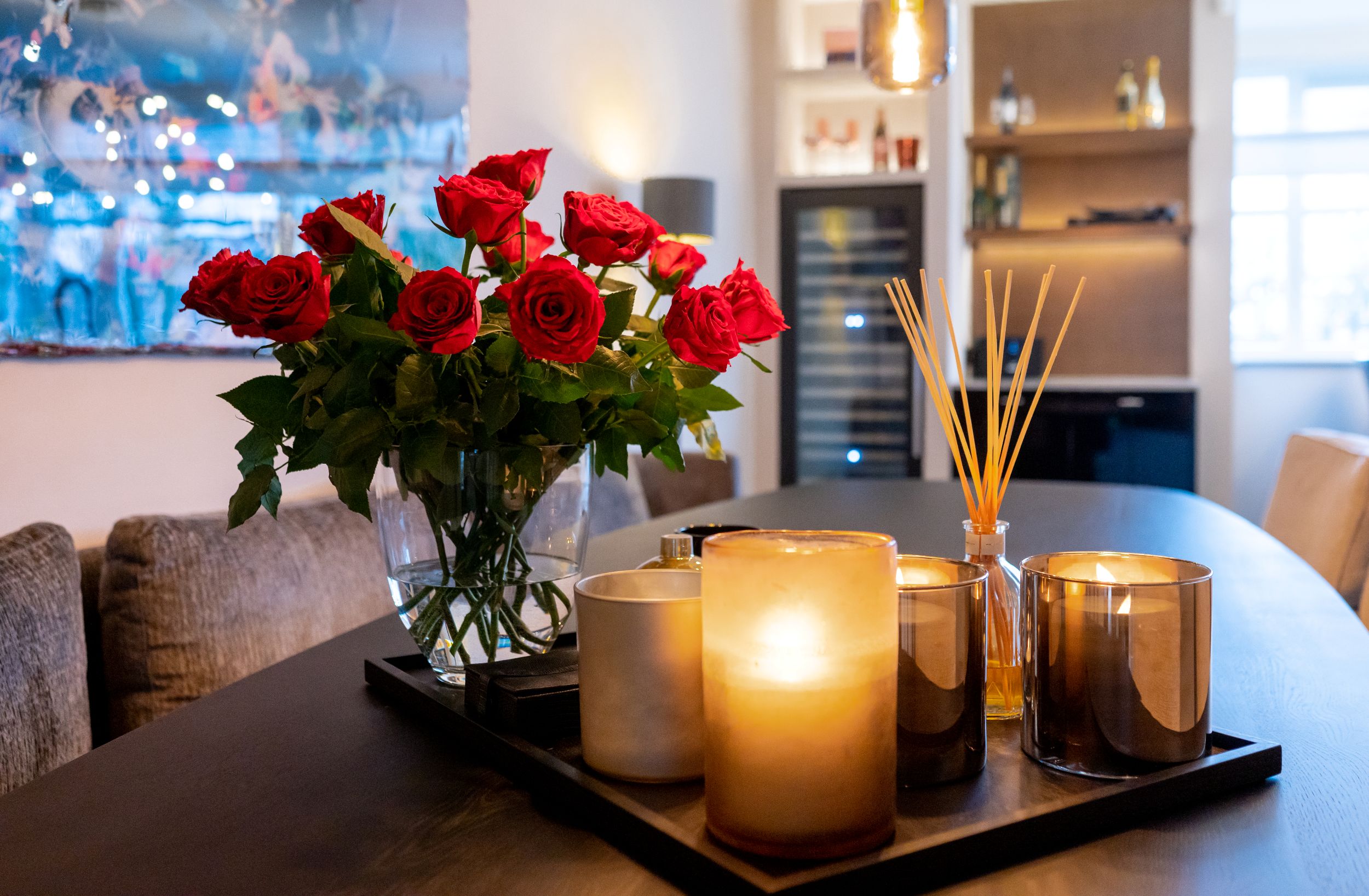 Nieuwe relatie, nieuw huis, dan ook andere meubels. Op de buffetkast – zwart geschilderd! – en salontafel na is alles nieuw aangeschaft bij Nuance en De Toren, zoals de hoekzitbank die groot genoeg is voor de hele familie om voor de openhaard neer te ploffen en TV te kijken. In de keuken staat een extra lange tafel met zitbank en comfortabele stoelen. Aan de wand een intrigerend kleurrijk werk, een soort druk stilleven in gemengde techniek, van kunstenaar Bram Reijnders dat Heleen en Dennis samen hebben uitgezocht. Fleurige eyecatchers zijn ook de XXL-vazen op zuil die door 4Suze zijn aangekleed met enorme kunstbloemenboeketten.